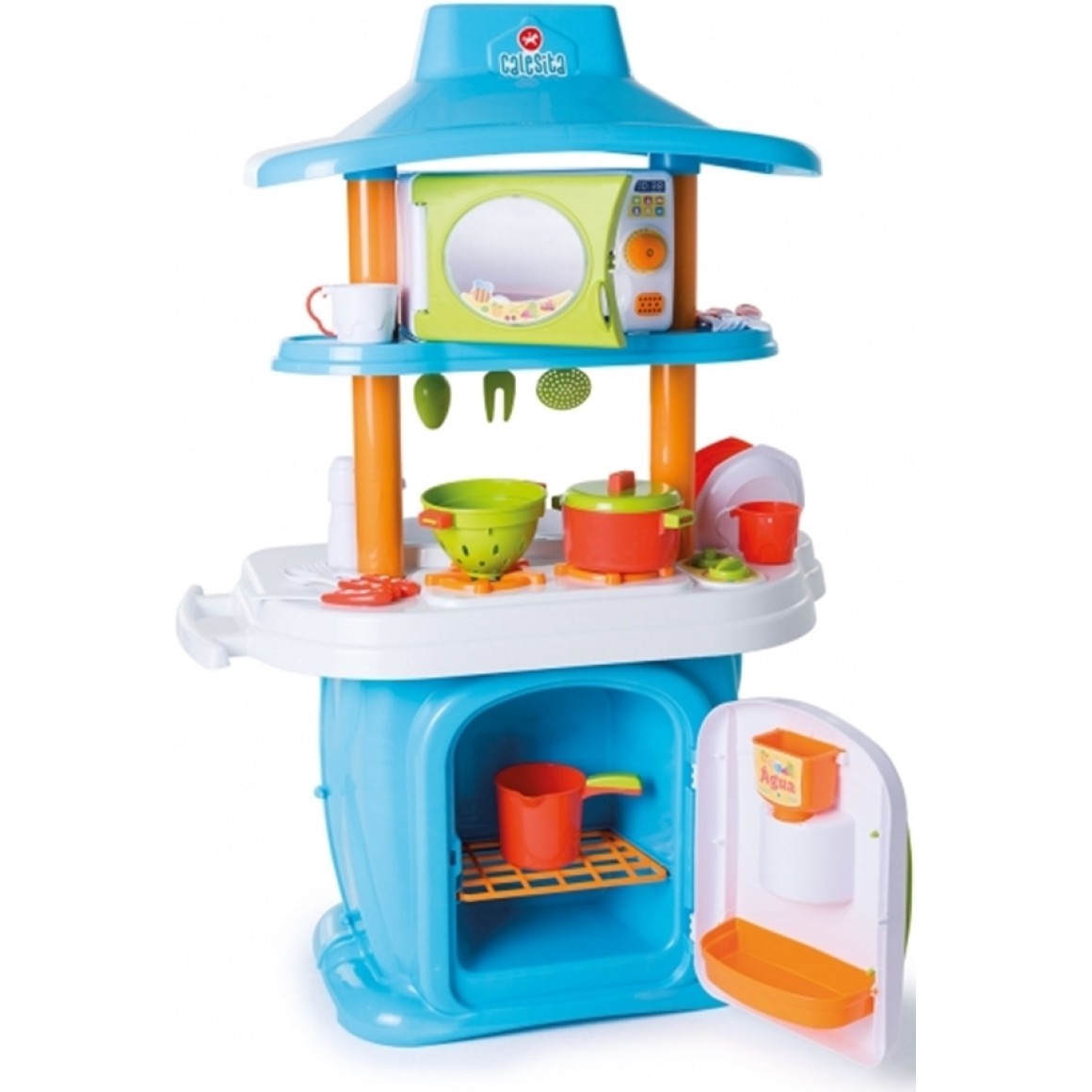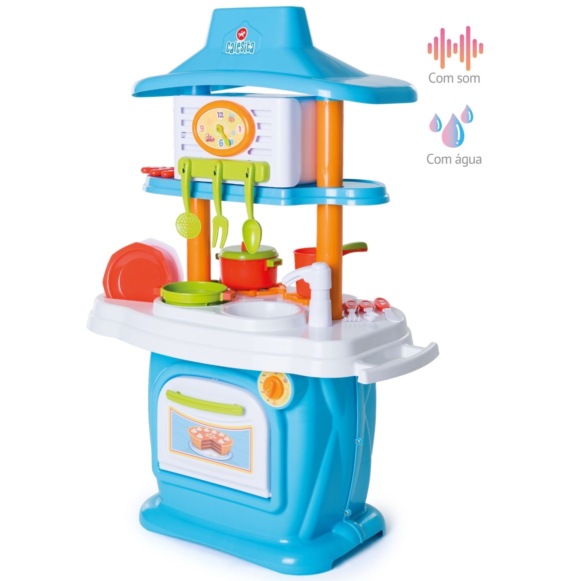 De um lado uma geladeira com dispenser de água na porta que funciona de verdade, fogão e um forno de microondas que faz barulho igual ao da mamãe! Do outro, um forninho e uma pia que vem com uma torneira que sai água! Nela dá para lavar os pratinhos, talheres, copos e panelinhas que vem junto com a Le Grand Chef!