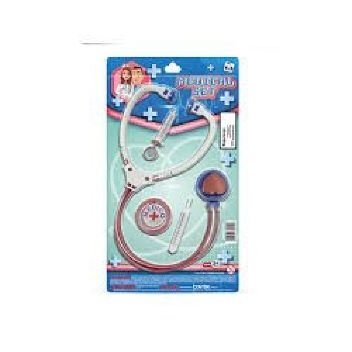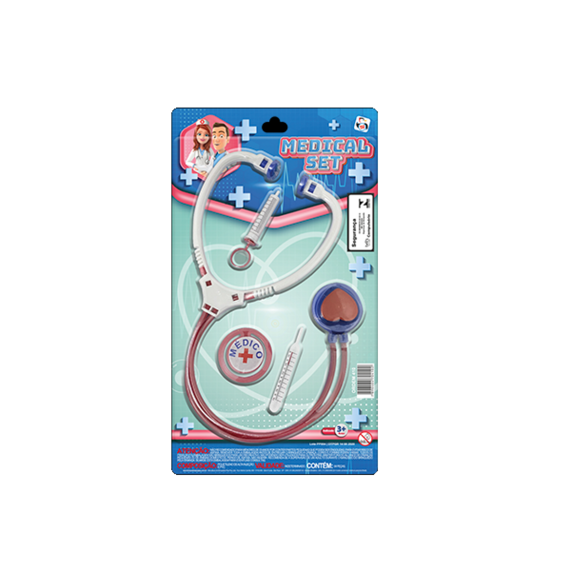 1 estetoscópio , 1 seringa , 1 termometro e 1 broche de médico