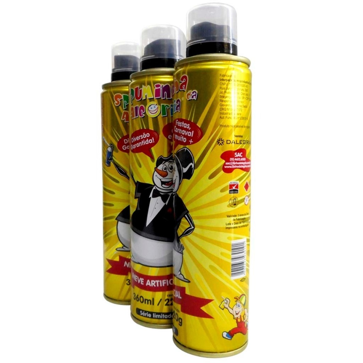 Espuminha da alegria, para as crianças fazerem a festa nesse carnaval Composição: Água desmineralizada, Decil Poliglucosídeo, Ésteres Esteárico, Palmístico, Mirístico, Emulsionantes e Propelente. Cores: Branca. Tamanho de cada peça: 23cm. Peso de cada produto: 306gr.