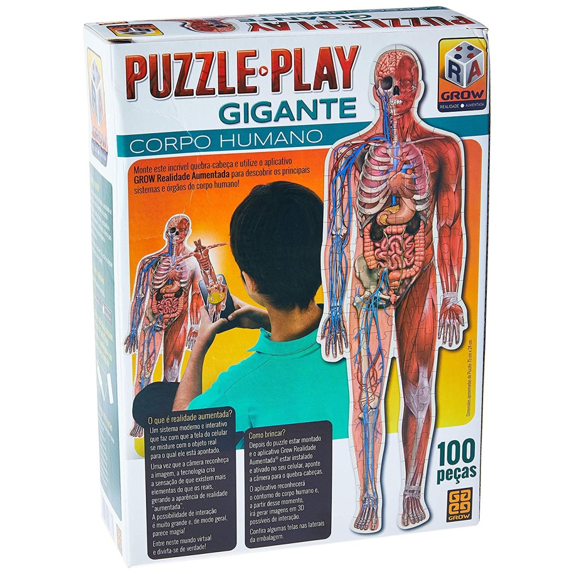 Além de estimular o raciocínio lógico e a concentração, o quebra-cabeça do Corpo Humano com realidade aumentada oferece às crianças um jeito divertido e interativo de aprender tudo sobre a nossa anatomia. A imagem do puzzle é uma ilustração educativa do corpo humano com peças com formato de alguns órgãos e um aplicativo de celular ou tablet que facilita à criança visualizar, em três dimensões, os sistemas do corpo (digestório, musculoesquelético, circulatório, respiratório e nervoso).