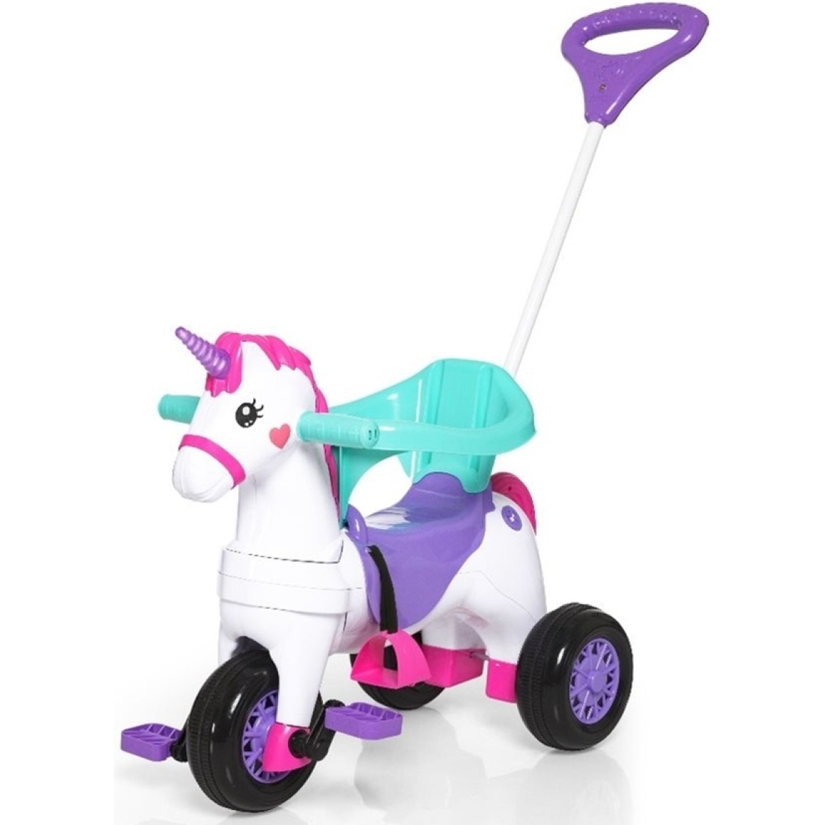 Direção guiada pelo adulto com facilidade e segurança para manobrar; Com melodias e luzes; Apoio de pé removível; Encaixe e desencaixe o empurrador com praticidade; Luz ao tocar o som; Ao retirar os acessórios o guidão gira e a criança pode pedalar; Certificação de Segurança do INMETRO; Idade Recomendada para passeio: A partir de 12 meses; Idade Recomendada para pedal: A partir de 24 meses; Peso Máximo recomendado: 30 kg;