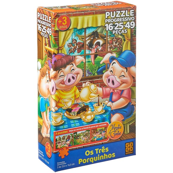 Com 3 quebra-cabeças que contam a história dos Três Porquinhos. A criança monta os quebra-cabeças e pode ler a história no verso da embalagem.