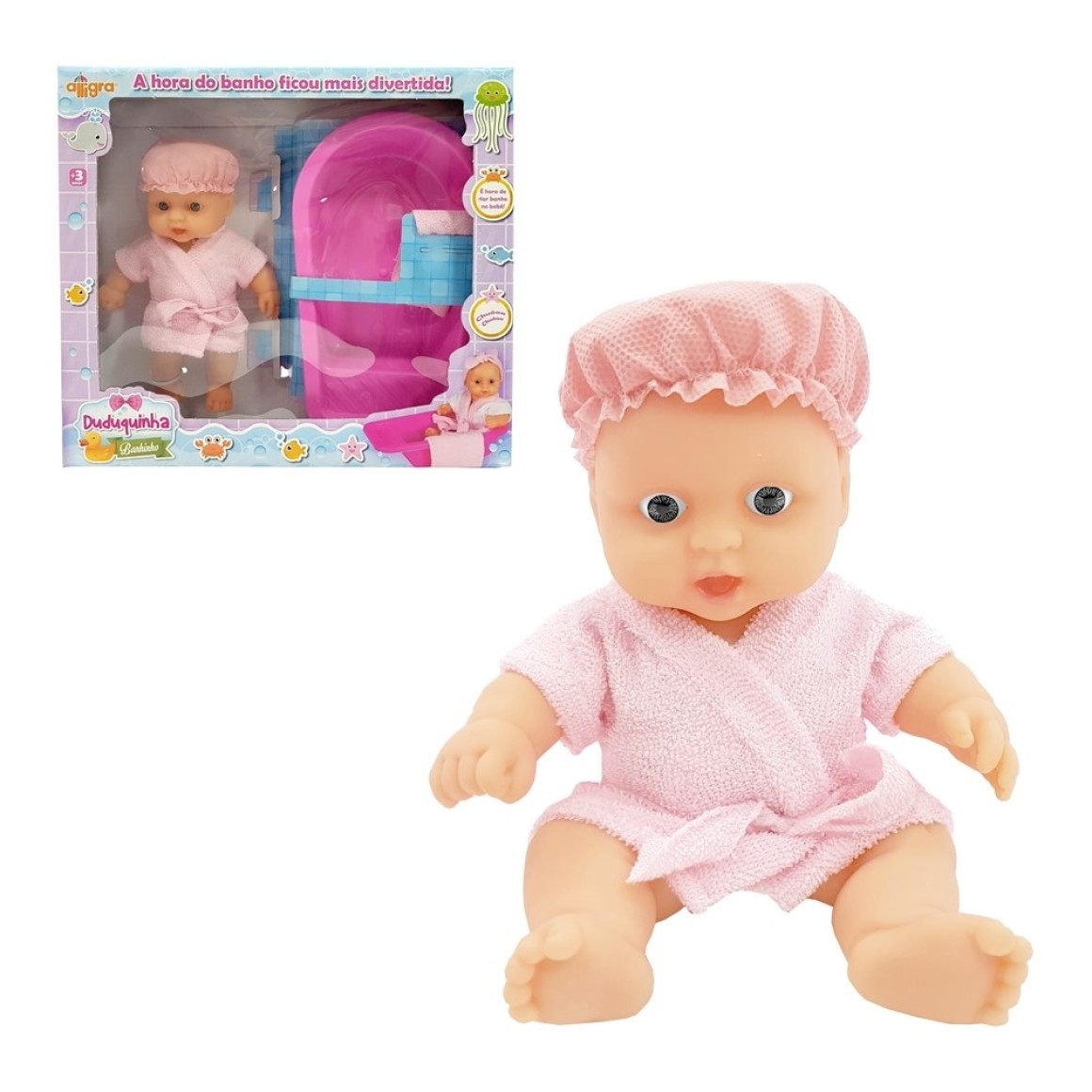 bonequinha toda em vinil com touca e roupão + banheirinha e toalha