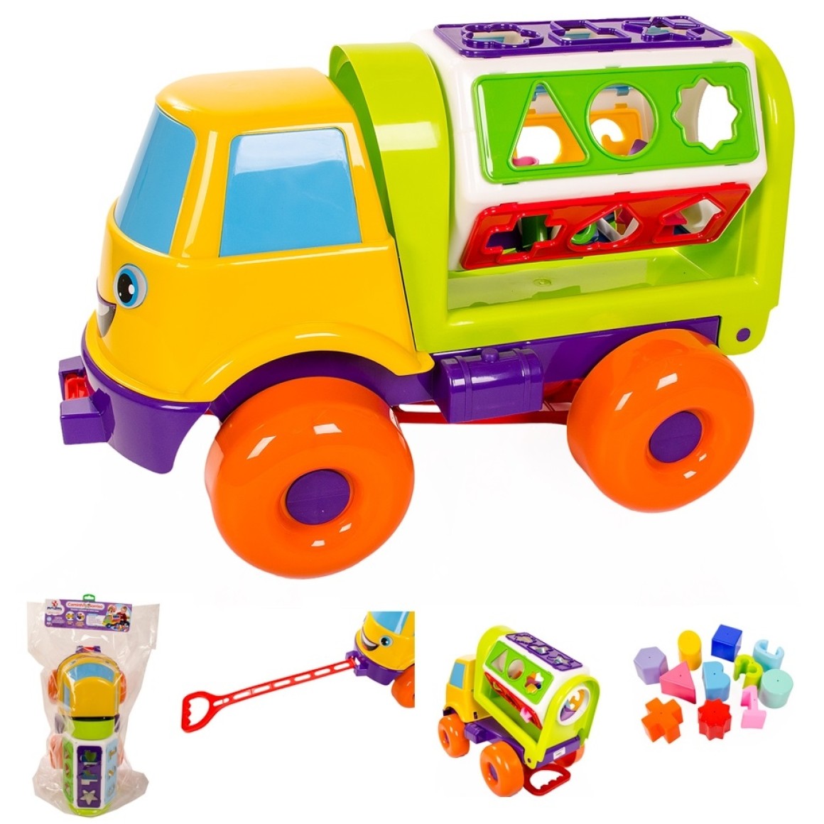 Caminhão com peças didáticas de em caixe nos formato de letras numeros e formas geométricas.O caminhão acompanha alça para puxar.
