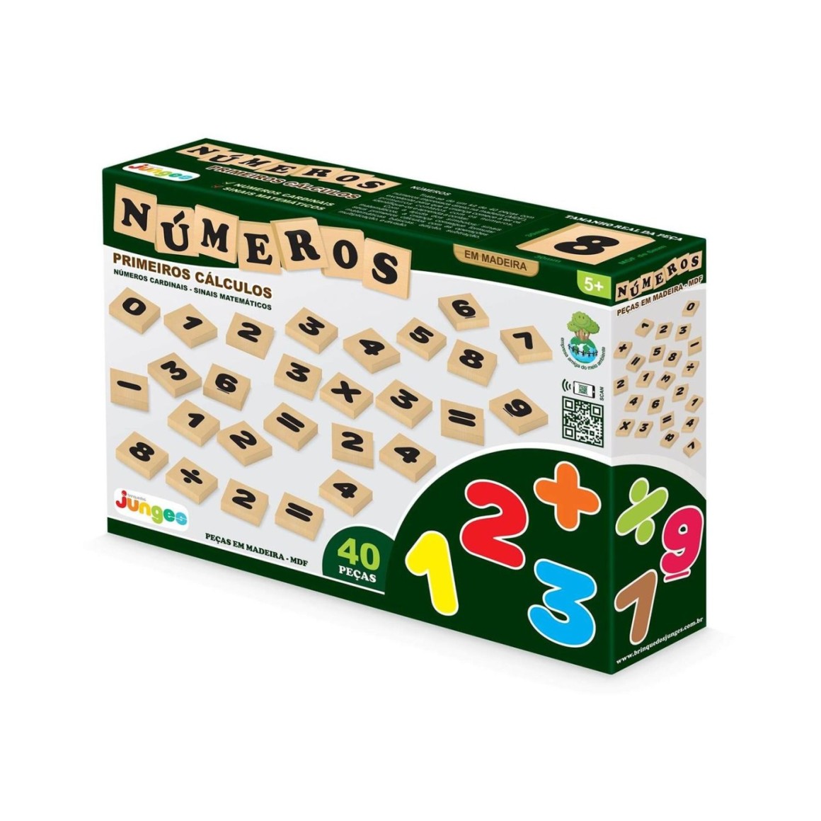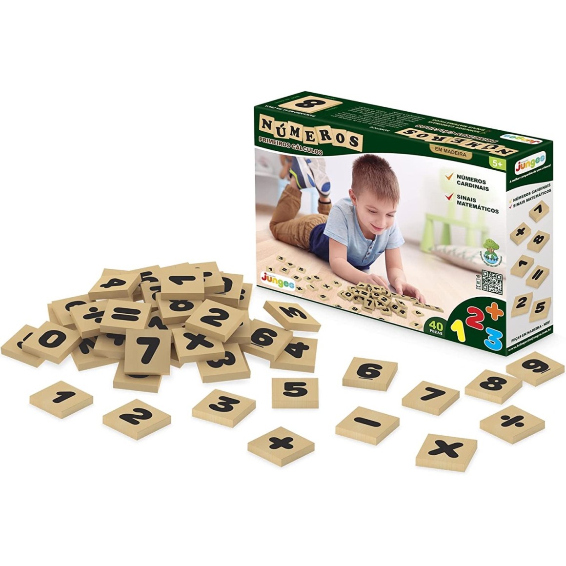 Meus primeiros cálculos com números cardinais, sinais matemáticos e tabuada completa! Números da Junges com 40 peças em madeira de reflorestamento (MDF) 6mm, tamanho de 3x3cm impressas em serigrafia, com números e sinais matemáticos (tabuada completa). Ideal para a criança elaborar seus primeiros cálculos! Incentive as crianças a aprender de uma forma divertida e descontraída! Aproveite e conheça outros brinquedos didáticos em nosso site!