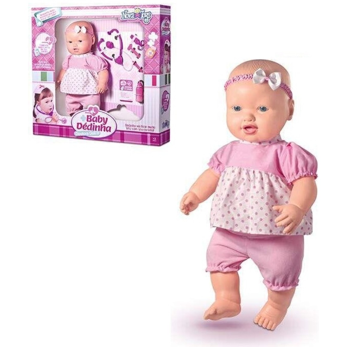 A imaginação das crianças é infinita e como a Boneca Baby Dedinha precisa de cuidados ela vai adorar ser a médica para cuidar da boneca doente. Acompanha muitos acessórios para a criança cuidar do bebê como se fosse de verdade. Braços e pernas articuláveis fazendo com que a boneca pareça muito mais real. A boneca tem aproximadamente 62 cm de altura. Dedinha vai ficar muito feliz com o seu carinho.