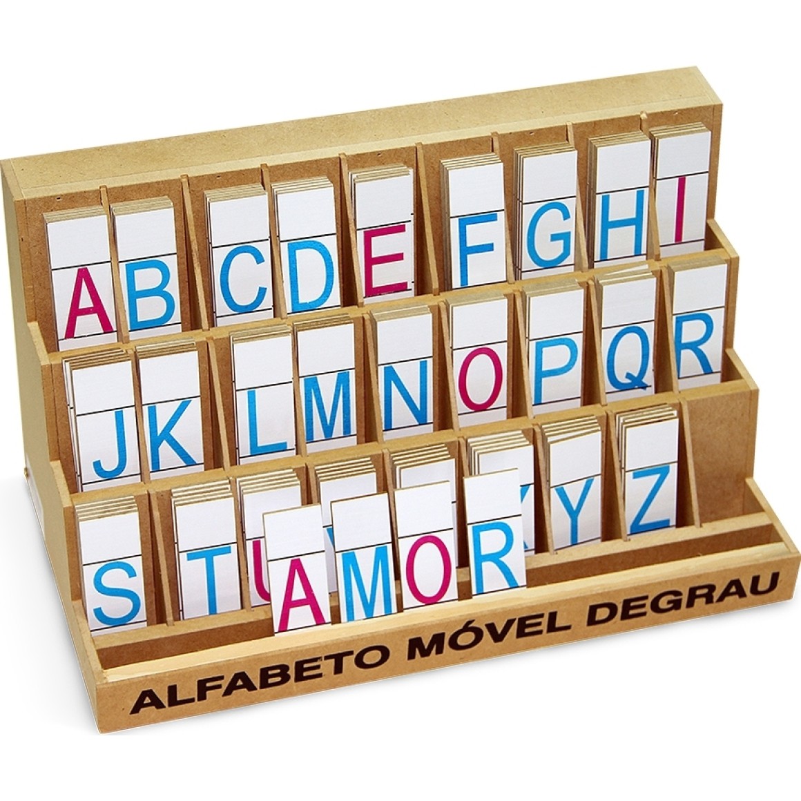Jogo com 130 peças, 1 expositor contendo 3 degraus, com 9 repartições por andar, medindo 10 x 4,5 cm. Contém: 5 jogos de alfabeto completo, letra de forma sendo: Consoantes - Um lado com consoantes maiúsculas em letra de forma e no outro lado, consoante minúscula em letra de forma. Vogais - Um lado com vogais maiúsculas em letra de forma e no outro lado, com vogais minúsculas, Cada peça de letra mede 3 x 9 cm. Os caracteres das fontes são alinhados em relação a uma linha de base delimitando a altura das letras maiúsculas. Base do expositor medindo: 38 x 20,5 x 20 cm.