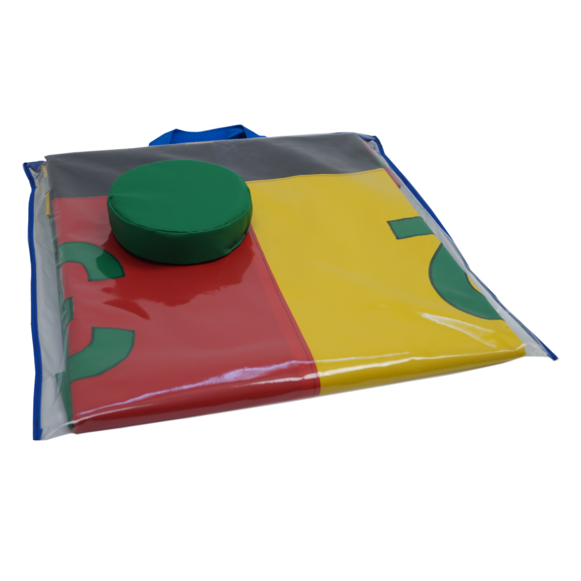 Trabalha a motricidade infantil através da tradicional brincadeira de Amarelinha. Por ser um tapete, facilita a locomoção do jogo sendo prático para uso interno ou externo ao ambiente escolar. Descrição:
