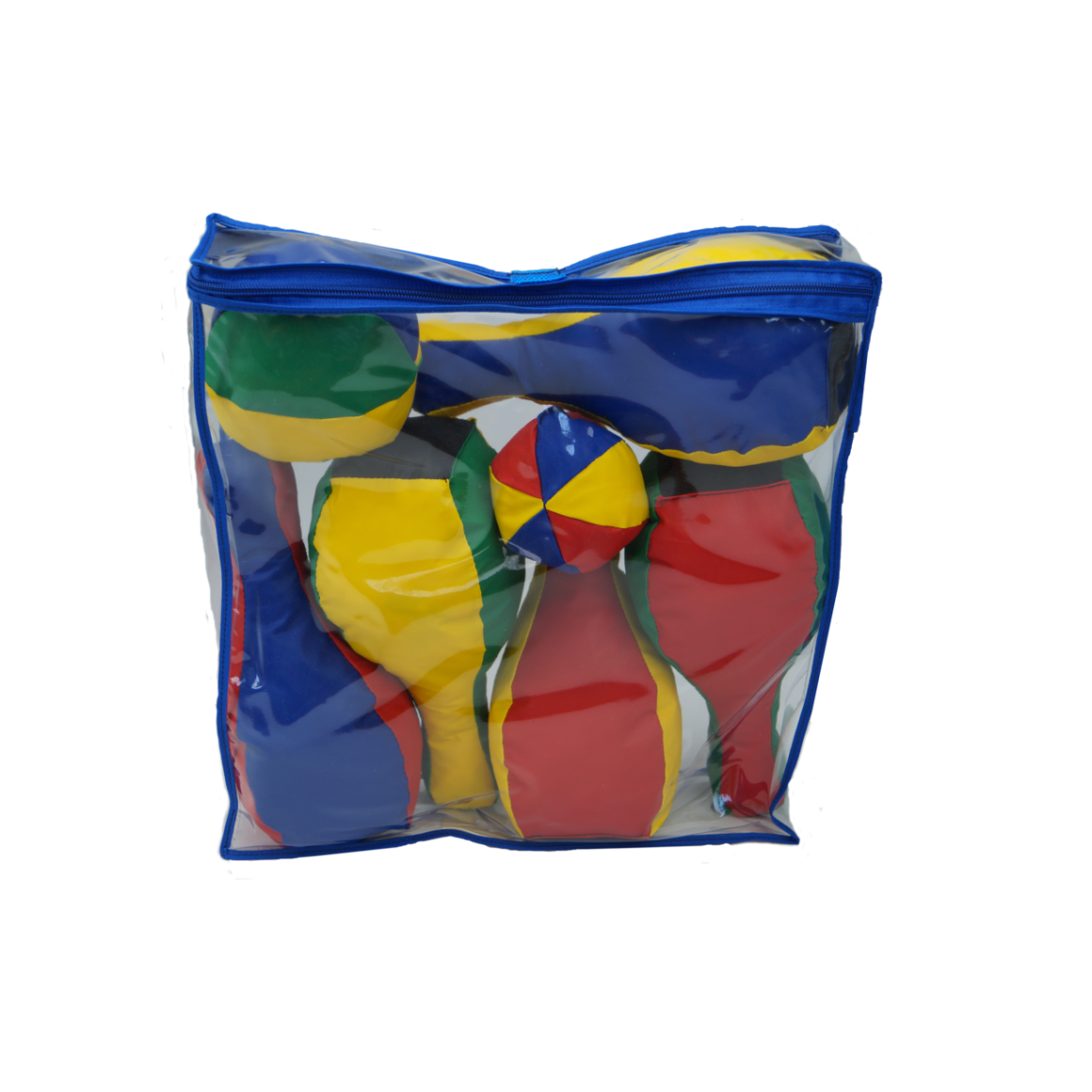 Composto por 5 pinos medindo aproximadamente 29 cm cada e duas bolas. Todos confeccionados em bagum com recheio de espuma em flocos. Com embalagem para guardar.