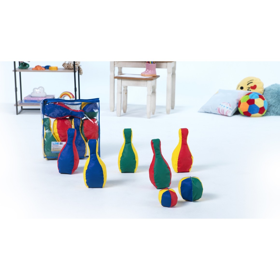 Com peças de bagum e enchimento de espuma em flocos, a diversão fica muito mais segura. O jogo conta com cinco pinos e duas bolas. Além da mobilidade da criança para acertar os pinos o educador pode trabalhar quantidade, cores, entre outras formas de aprendizagem. O Jogo de Boliche da LDM Brinquedos é diversão garantida dentro de sala, no ambiente escolar, no pátio e também em casa com a família, estimulando o trabalho em equipe e o envolvimento de todos em função do objetivo de derrubar os pinos.