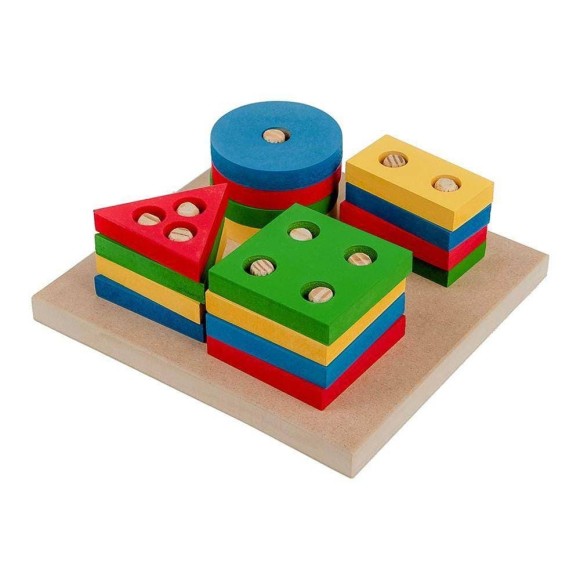 Base medindo 19 x 20 cm com pinos fixos de madeira que servem de encaixe para as peças, com quantidade de pinos proporcional ao número de orifícios das peças. 16 peças geométricas coloridas, usinadas e vazadas sendo divididas em 4 formas e vazadas de acordo com a forma (quadrado - 4 orifício, retângulo - 2 oríficios, triângulo - 3 orifícios, e círculos - 1 orifício).