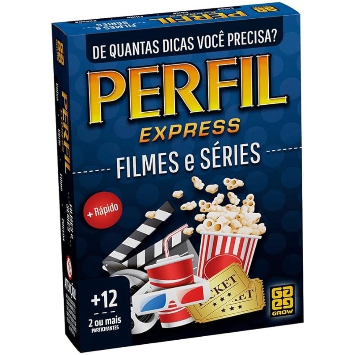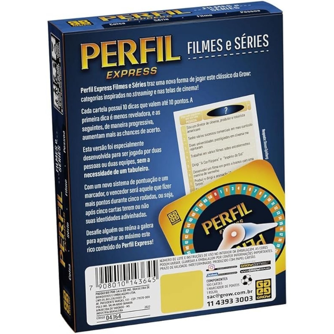 - Perfil Express Filmes e Séries é a novidade de um dos maiores clássicos da Grow. Ele traz uma nova forma de jogar através de categorias inspiradas no streaming e nas telas de cinema! Cada cartela possui 10 dicas que valem até 10 pontos. A primeira dica é menos reveladora, e as seguintes, de maneira progressiva, aumentam mais as chances de acerto. Esta versão foi especialmente desenvolvida para ser jogada por duas pessoas ou equipes, sem a necessidade de um tabuleiro. Com um novo sistema de pontuação, o vencedor será aquele que fizer mais pontos durante cinco rodadas. Desafie alguém ou reúna a galera para aproveitar ao máximo o novo Perfil Express Filmes e Séries!