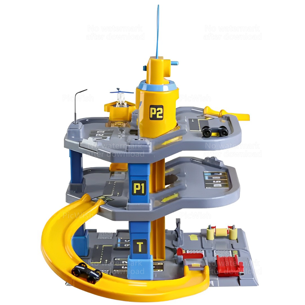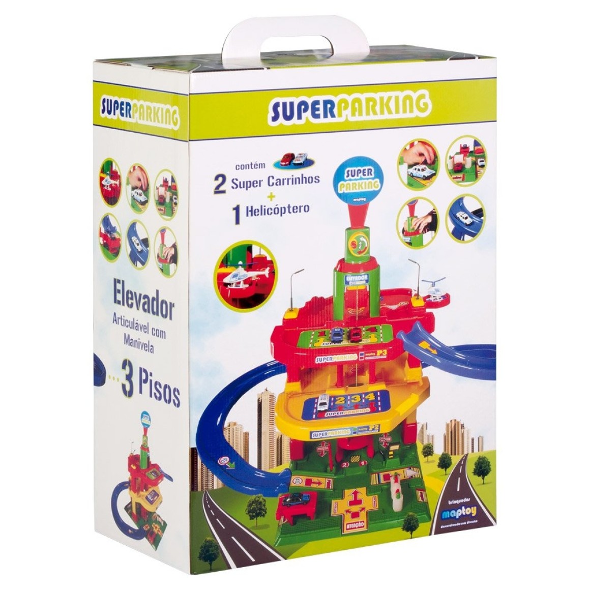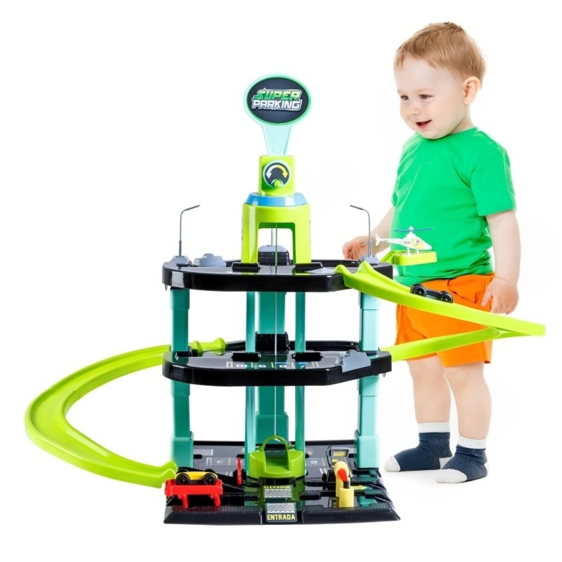 Posto de gasolina com 3 andares com 4 carrinhos e 1 helicoptero.