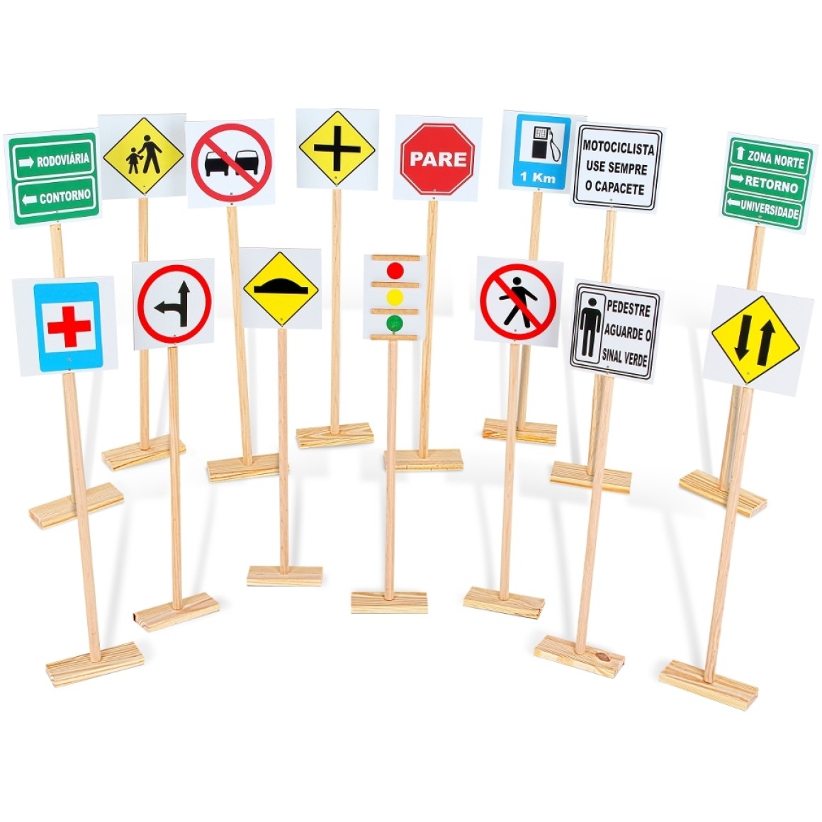 Descritivo detalhado: Confeccionado em madeira e M.D.F. Composto por 15 peças medindo 90 cm de altura, sendo: 01 semáforo (base/placa) medindo: 15 x 20 cm e 14 placas de sinalização (base/placa) medindo: 20 x 20 cm, serigrafadas com as cores conforme as normas de trânsito.