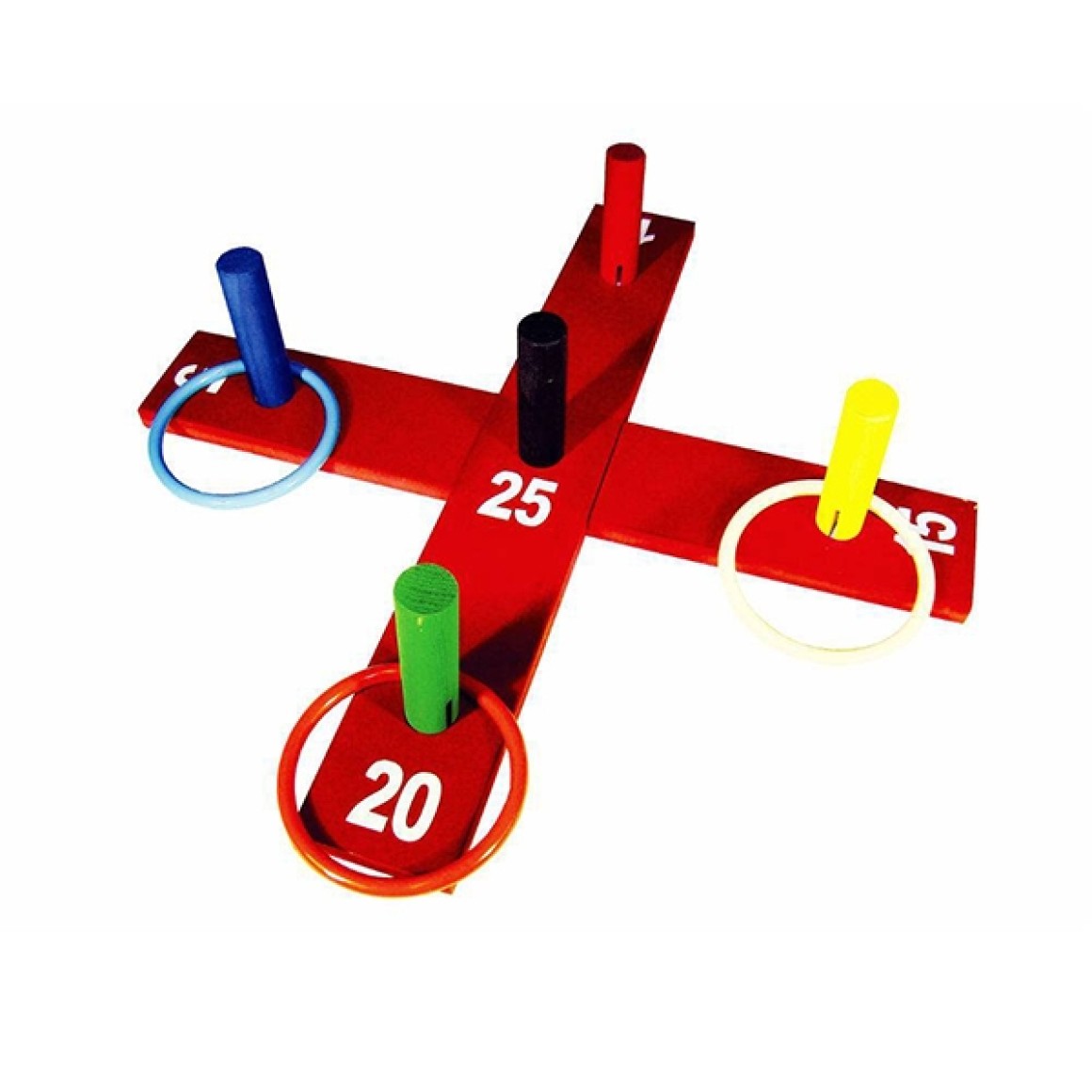 Descrição: 2 peças medindo 45 x 7 cm, que se encaixam em cruz, formando a base. Com as pontuações serigrafadas em 1 cor, 5 pinos coloridos de madeira, que se encaixam na base, 3 argolas de plástico resistentes e coloridas para lançar nos pinos.