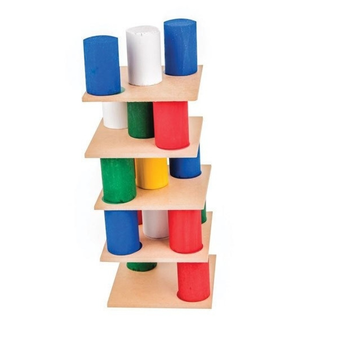Descritivo detalhado: Confeccionado em madeira e M.D.F. - 18 placas medindo 7,5 x 7,5 cm e 45 cilindros de madeira pintados medindo 3,5 cm de altura, pintados com tinta atóxica nas cores: vermelha, verde, laranja, amarela e azul. Total de peças do jogo: 63 peças. Embalagem: Caixa de madeira com tampa serigrafada medindo 20 x 20 x 8 cm. Lacrada com película de P.V.C. encolhível.