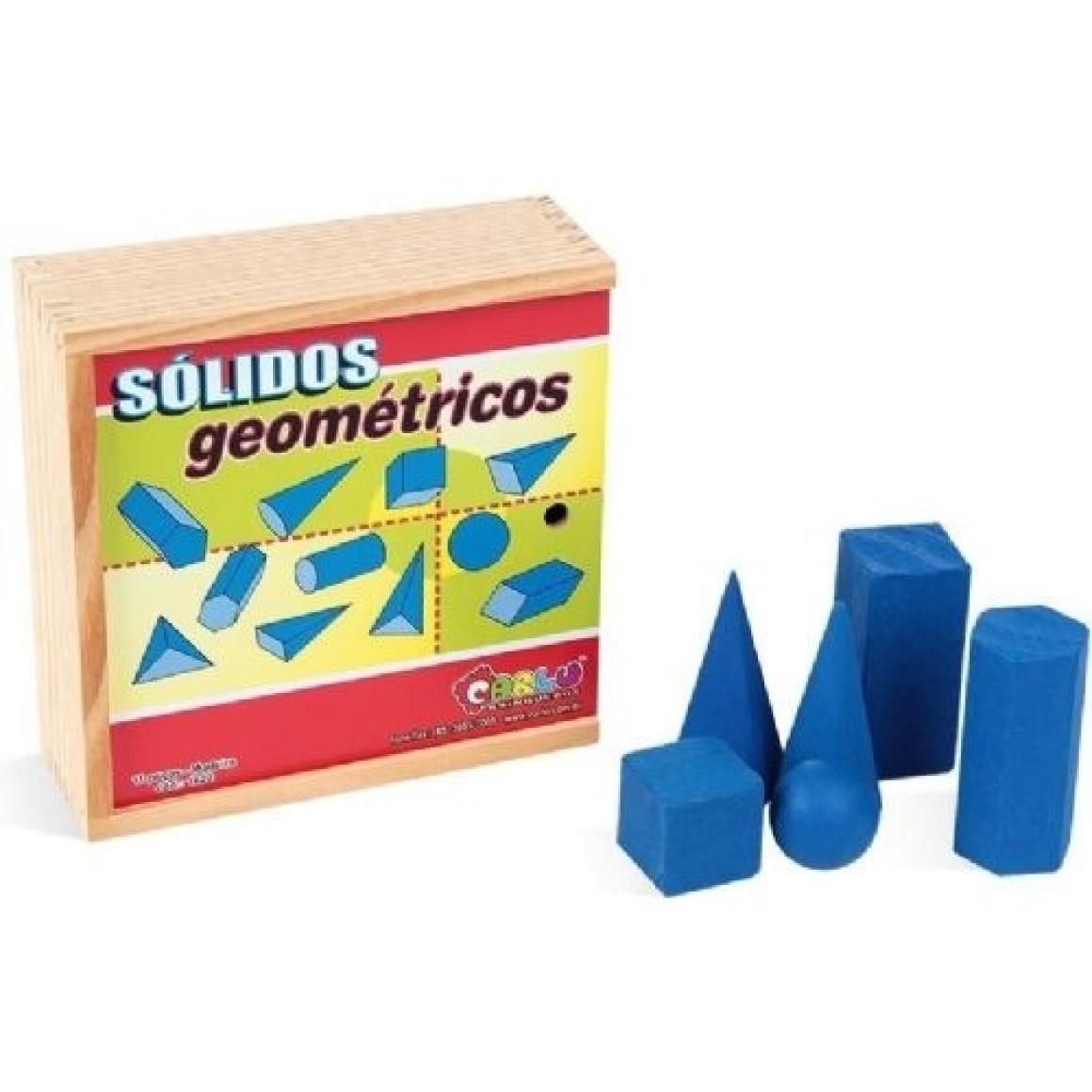 Descritivo detalhado: Confeccionado em madeira com 11 formas geométricas (tetraedro de 3 x 3 cm, pirâmide de base quadrada de 3,5 x 3,5 x 8 cm, pirâmide de base retangular de 3,5 x 2 x 8 cm, pirâmide de base triangular de 3,5 x 8 cm, cone, esfera de 4 cm de diamêtro, cubo de 3,5 x 3,5 cm, cilindro de 3,5 x 8 cm, paralelepípedo de 3,5 x 8 x 3,5 cm, prisma de base pentagonal de 3,5 x 3,5 x 8 cm e prisma de base hexagonal de 3,5 x 4 x 8 cm.) pintadas com tinta azul atóxica. Embalagem: Caixa de madeira com tampa serigrafada medindo 18 x 18 x 6 cm. Lacrada com película de P.V.C. encolhível.