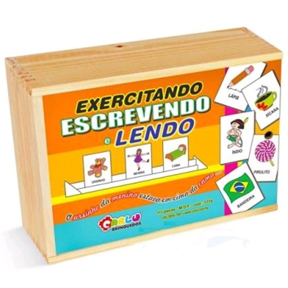 Descritivo detalhado: Confeccionado em M.D.F. 110 peças, sendo: 110 desenhos com nomes (abaixo da ilustração do desenho está escrito o nome correspondente ao desenho ex: Ilustração (Castelo) - Castelo, Ilustração (Nuvens com gotas) - Chuva, etc.), 01 canaleta organizadora (com 01 divisória para encaixe das peças e 01 régua solta para esconder o nome do desenho) todas pintadas e serigrafas em uma das faces com tinta ultravioleta atóxica. Peças com desenho medindo 5 x 7 cm, canaleta medindo 25,5 x 5 x 3 cm e régua solta medindo 24,5 x 1,3 cm. Embalagem: Caixa de madeira com tampa serigrafada medindo 28 x 20 x 9 cm. Lacrada com película de P.V.C. encolhível.